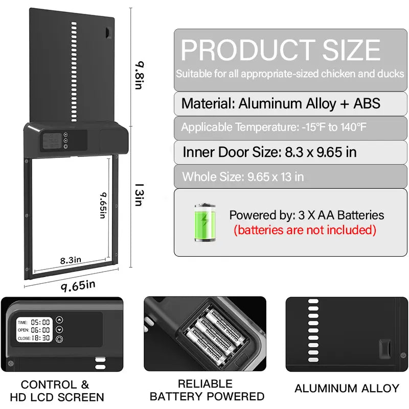 - Smooth, Slow Motor: The door panel slides gently to prevent pinching curious chickens.